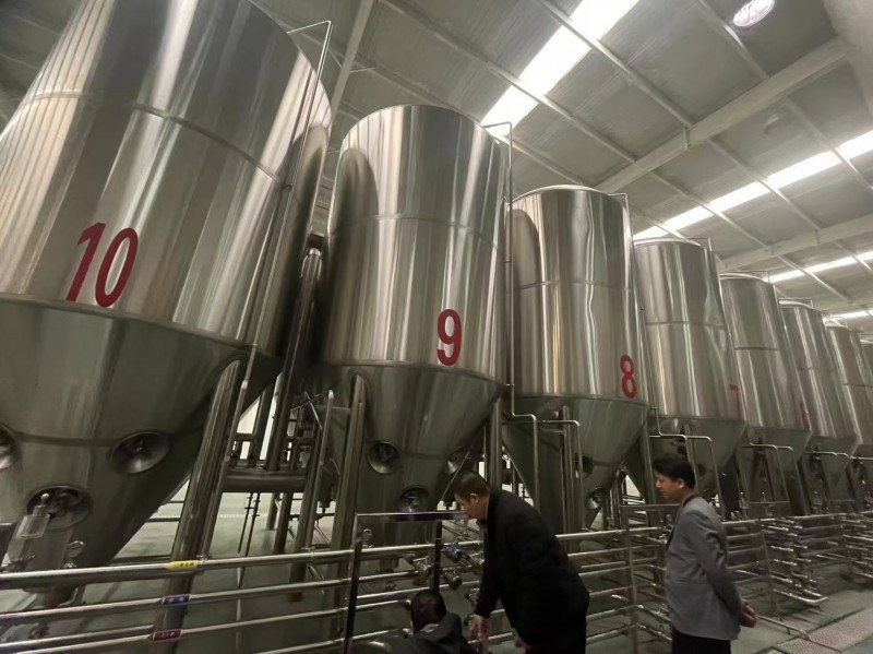 啤酒厂设备啤酒发酵罐,大型啤酒厂一般采用室外露天发酵罐配置,发酵罐顶部配备罐顶平台,发酵罐罐顶会配有罐顶装置;啤酒发酵是采用的酵母菌种,将采用酵母扩培系统以及酵母添加系统进行自动化处理;啤酒添加辅料时,还会配有啤酒稳定剂添加罐等配置组成
