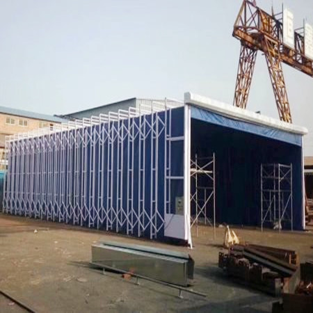 伸缩移动式喷漆房为整体框架传动结构,每组框架均采用阻燃PVC布密封连接,安装快捷,外形美观,结构紧凑,使用方便,制造成本低,节省投资;