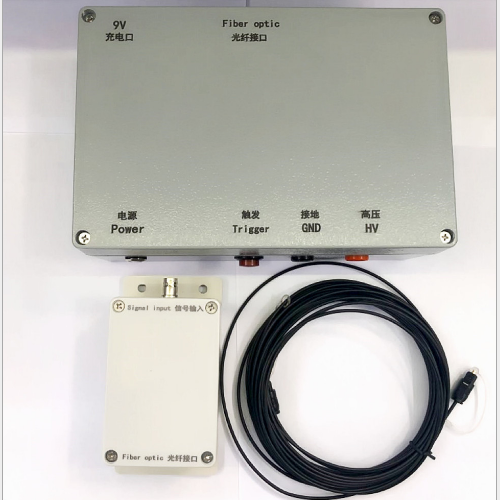 冲击发生器耦合电容连接到光接收盒上面,待冲击发生器触发瞬间,脉冲信号给到光接收器。信号由光纤传输到触发盒内部,经过内部延时放大电路,高压脉冲输出到截波球装置。形成所需要的延时脉冲。