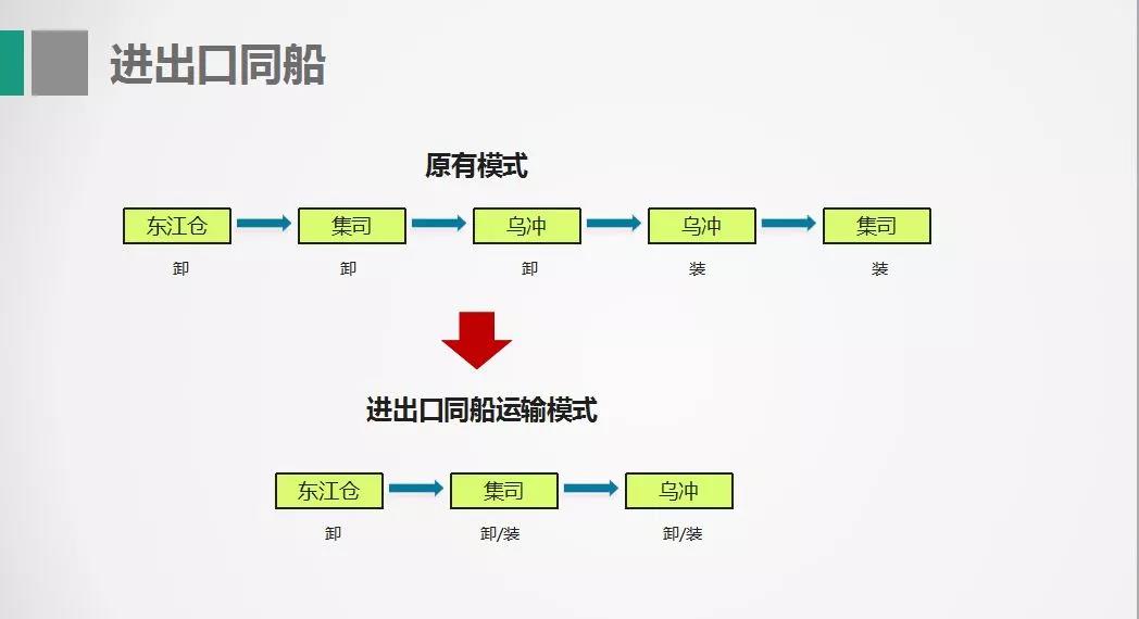 进出口同船运输指经海关核准备案的监管船舶,同时承载进口和出口集装箱货物的运输,由来往港澳小型船舶运输。