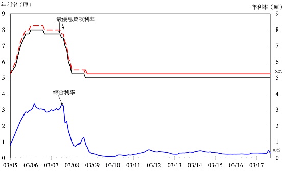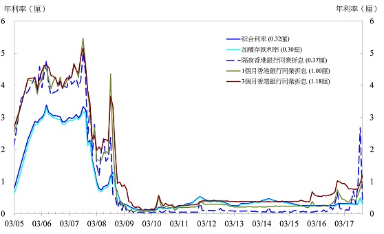 1 综合利率是指银行帐册上所有港元附息负债的加权平均利率,这些负债包括客户存款、银行同业存款、可转让存款证及其他债务工具,以及港元不计息活期存款。综合利率是根据约占银行体系总客户存款九成的零售银行所提供的资料编制。应注意综合利率只反映平均利息支出,并未涵盖借出贷款涉及的其他成本,如营运成本(如员工及租务支出)、信贷成本及对冲成本。