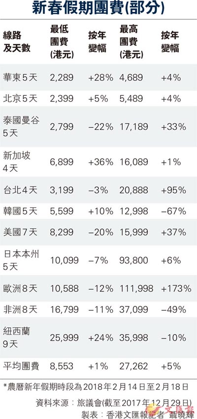 香港新闻网1月4日电 据香港《文匯报》报道,圣诞新年假期刚结束不久,都市人又重返忙碌的生活,但不少港人正计划於下月农历新年假期间外游。香港旅游业议会昨日公佈,今年农历新年假期的普通团平均团费为8,553元,按年升1%,其中最低价北京5天团仅盛惠2,399元。豪华团方面,今年平均团费27,262元,按年升5%,其中最贵价的欧洲8天团索价逾11万元,按年大增173%。旅游业议会指出,今年圣诞与农历年假期相隔逾一个月,加上经济环境不错,楼市、股市皆升,料农历年假参加旅行团人数按年增长3%至5%。