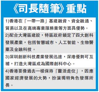 财爷陈茂波在最新网誌指出,特区政府会锁定四大範畴推动本港的创科發展,包括智慧城市、人工智能、生物医药及金融科技,具体政策措施将会陆续推出。他又强调,香港必须「灵活走位」,把握国家高速發展契机,积极参与「一帶一路」倡议、粤港澳大湾区發展、科技创新对经济的驱动,以自身优势配合国家需要,把握契机乘势转型,帶动经济再创高峰。