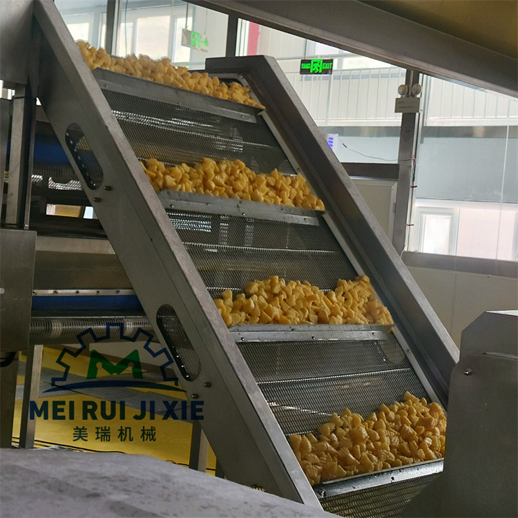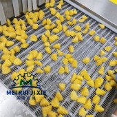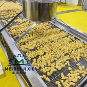 菩提南瓜就是南瓜块漂烫之后进行上浆上粉油炸,一整套的设备包括清洗机,漂烫机,风干机,上粉机,上浆机,油炸机,中间全部采用输送带连接输送,上料可选择提升上料,整个过程简单方便,节省人工。