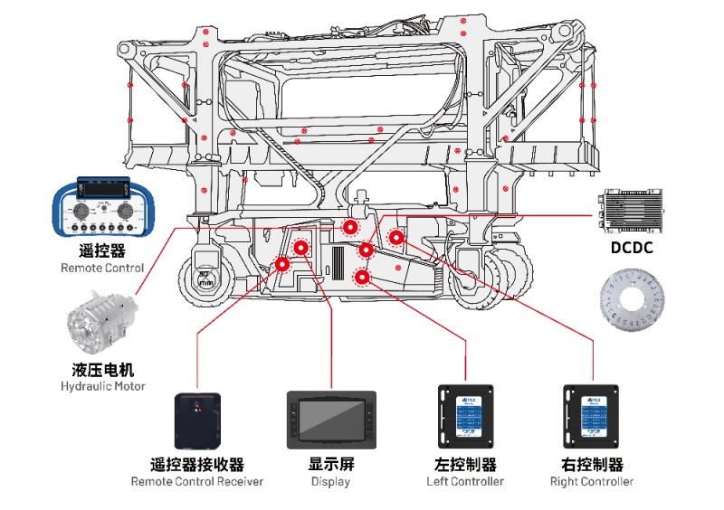 长沙硕博电子开发的跨运车电控系统采用模块化设计,构建起高效协同的硬件矩阵,核心组成包括:驾驶室控制器SPC-SFMC-X2612CM、前后就地电磁阀控制器SPC-SFMC-X2024G、驾驶室显示屏SPD-070-BAET、背带式遥控器SPR-HT-KYC01、电机电驱MSP38-100S707X1350H365、DCDC电源SP3000S27.5-1H1。同时集成雷达防撞系统360视频系统、操作台操作开关及各类检测传感器。系统以控制器为核心枢纽,通过CAN总线实现控制器、显示屏、遥控器与传感器之间的高速信息流通,确保指令传输精准、响应及时。