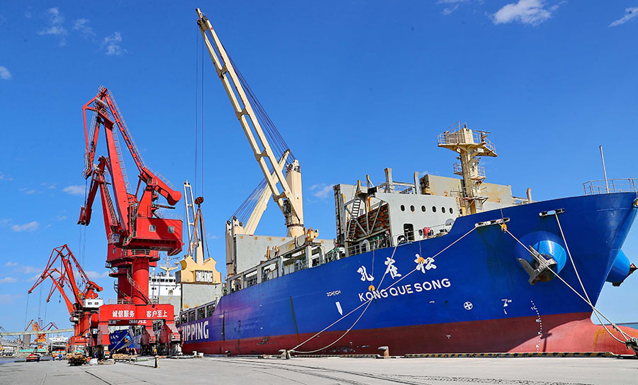 2020年5月12日,停靠在河北省秦皇岛港的“孔雀松”号货轮正在装运桥梁件。当日,我国与孟加拉国合作建设的“帕德玛”大桥的最后一批5500吨桥梁件由秦皇岛港运往孟加拉国的蒙格拉港。