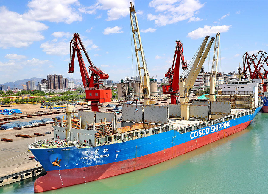 2020年5月12日,停靠在河北省秦皇岛港的“孔雀松”号货轮正在装运桥梁件。当日,我国与孟加拉国合作建设的“帕德玛”大桥的最后一批5500吨桥梁件由秦皇岛港运往孟加拉国的蒙格拉港。曹建雄 摄/光明图片